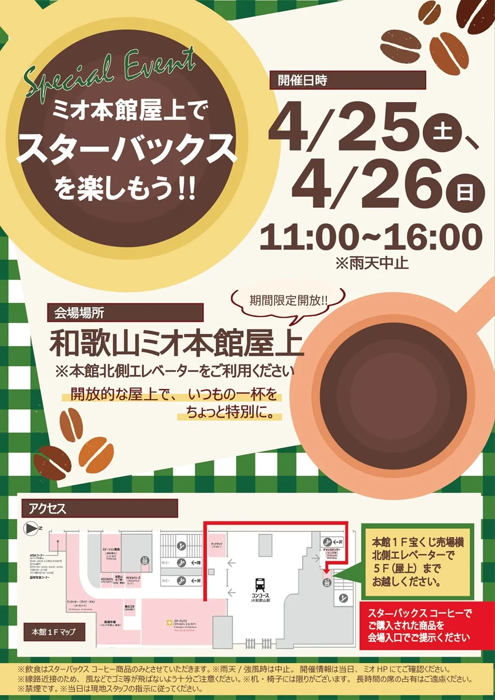 和歌山ミオでは、4月25日(土)、26日(日)に本館屋上にて、スターバックスのドリンクをお楽しみいただけるイートインイベントを開催いたします。