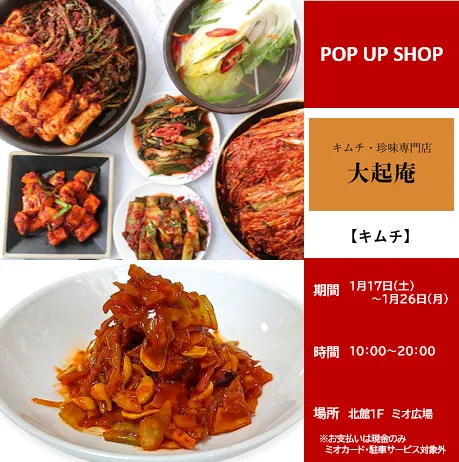 【本場韓国の味 キムチ専門店】として、漬けたて新鮮な本場韓国のキムチを販売しております。お料理のサイドメニュー、または一品としても食卓を一段と華やかに彩ります。 韓国の伝統的な製法で漬け込んだ大起庵のキムチはまさに本場韓国の味!厳選素材と秘伝のヤンニョムはキムチ専門店ならではのこだわりです。